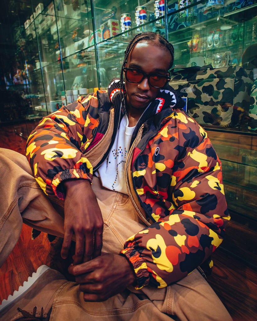 La première, le rythme des rues : hommage au hip-hop et à la culture graffiti, avec des pièces fortes comme le Shark Full Zip Hoodie en Tree Edge Camo, ou encore des vestes militaires aux découpes laser. La seconde, l’esprit du jeu : silhouettes athlétiques, matières techniques et graphismes électrisants comme le Wild Leopard Pattern. Entre football américain et snowboard, le sportswear BAPE® version 2025 est également fonctionnel. La dernière, la toile de créativité : ici, l’artisanat japonais rencontre le streetwear. Le Cloud Camo, inspiré du Karakusa, s’exprime à travers du denim indigo brodé façon Sashiko.