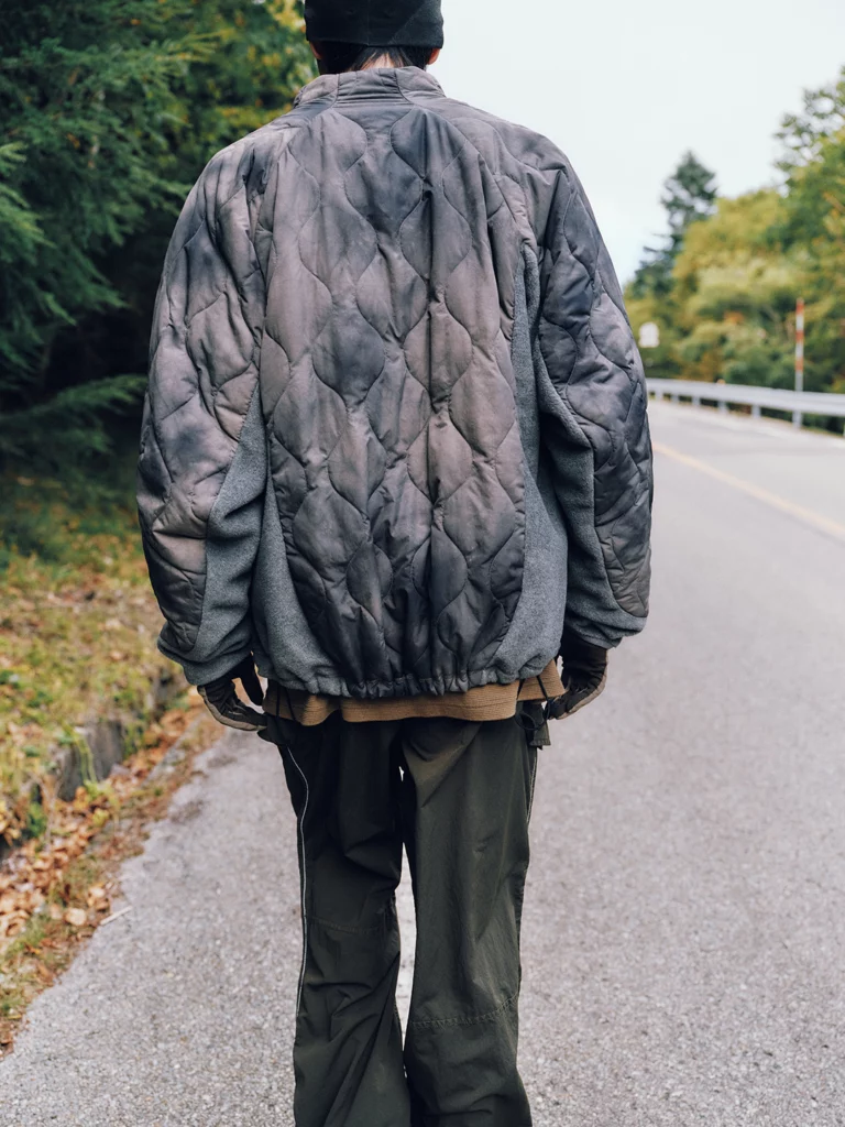 Les silhouettes, pensées pour l’exploration, mêlent la rigueur alpine et la finesse japonaise. Les matières réagissent à la lumière, épousent le mouvement, respirent avec le corps. Nylon, soft shell, tie-dye et polaire se combinent dans un jeu de contrastes, où la texture prend vie. Ici rien ne semble fantaisiste, tout est naturel, façonné par la pluie, le froid et la marche.